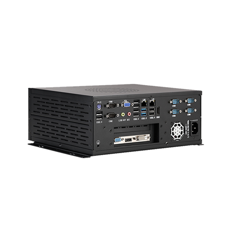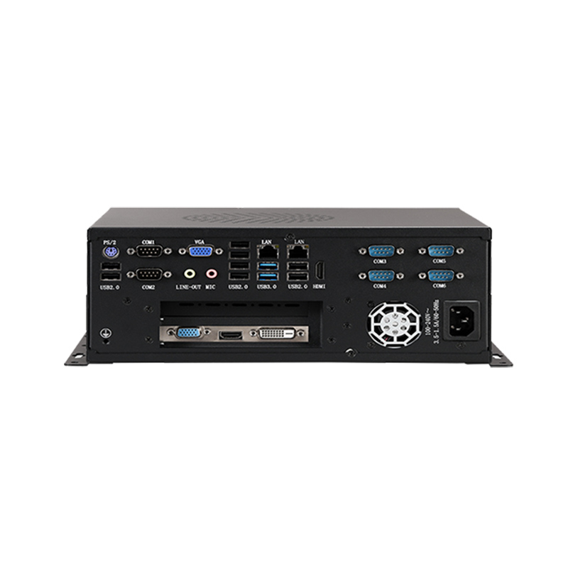 外觀設(shè)計 : 噴砂黑色外殼,工藝精細(xì),科技時尚高性能 : 支持4/6/7/8/9代Intel LGA1150/1151接口全系列處理器穩(wěn)定可靠 : 純工業(yè)設(shè)計,優(yōu)良的散熱結(jié)構(gòu),機(jī)箱內(nèi)置1*6015高速散熱風(fēng)扇,機(jī)箱可抗接觸式6KV強(qiáng)電磁干擾;AC100-240V輸入或者DC12V輸入(默認(rèn)AC100-240V輸入)接口豐富 : 2* Realtek LAN, 6*COM,10*USB, 8*GPIO, 1*遠(yuǎn)程開關(guān),VGA+HDMI,支持同步和異步,支持1*Msata ,1*2.5寸硬盤位,1*MINI PCIE支持 WIFI/4G(二選一),1*PCIEX16(可支持MINI 顯卡,長度180CM以內(nèi))或2*PCI(可二選一)
